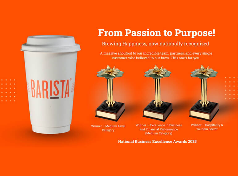 In 2025, this commitment was recognized at the National Business Excellence Awards, where Barista won in the Medium Level Category, Excellence in Business and Financial Performance – Medium Category, and the Hospitality & Tourism Sector. Barista was also named Bronze Winner – Glocal Brand of the Year and Merit Winner – Agile Brand of the Year.